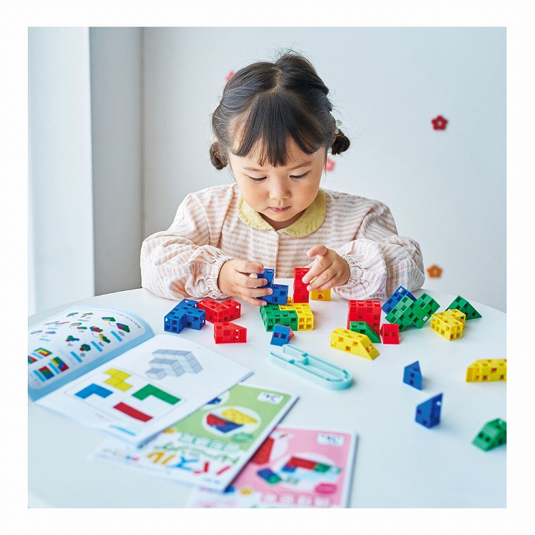 全54問のパズル問題に取り組めるテキスト3冊付きで、あそびながら図形感覚や空間認識、考える力を伸ばすことができます。