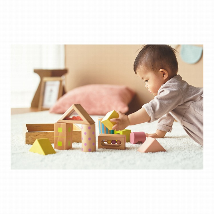 木箱にはめたり、高く積み上げることで、想像力や集中力を育みます。