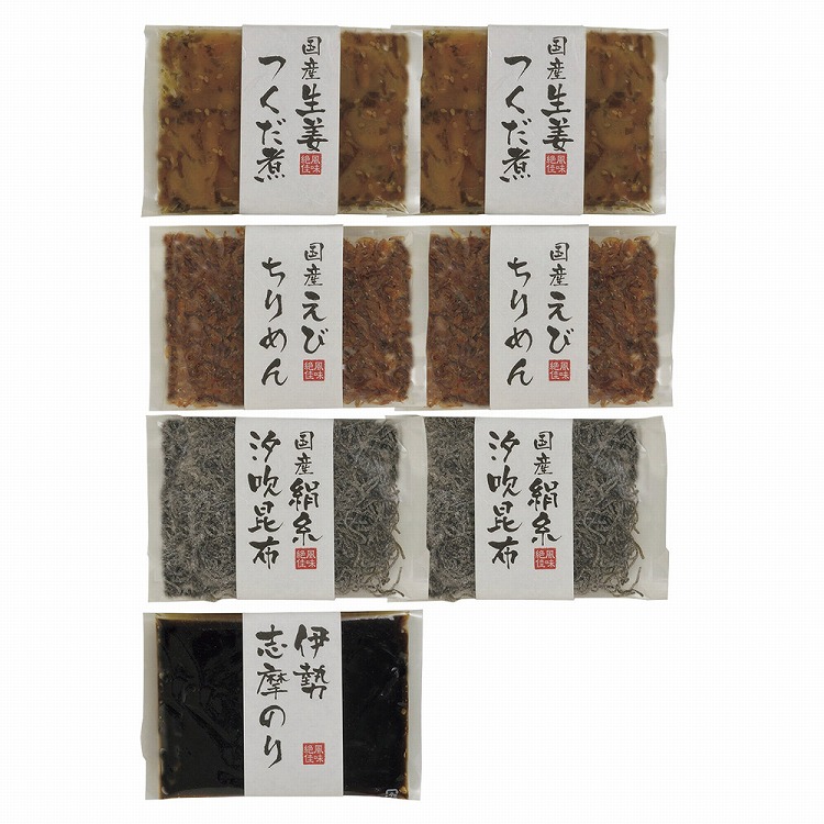 商品内容●セット内容:生姜つくだ煮50g・えびちりめん30g・絹糸汐吹昆布20g各2、伊勢志摩のり100g×1