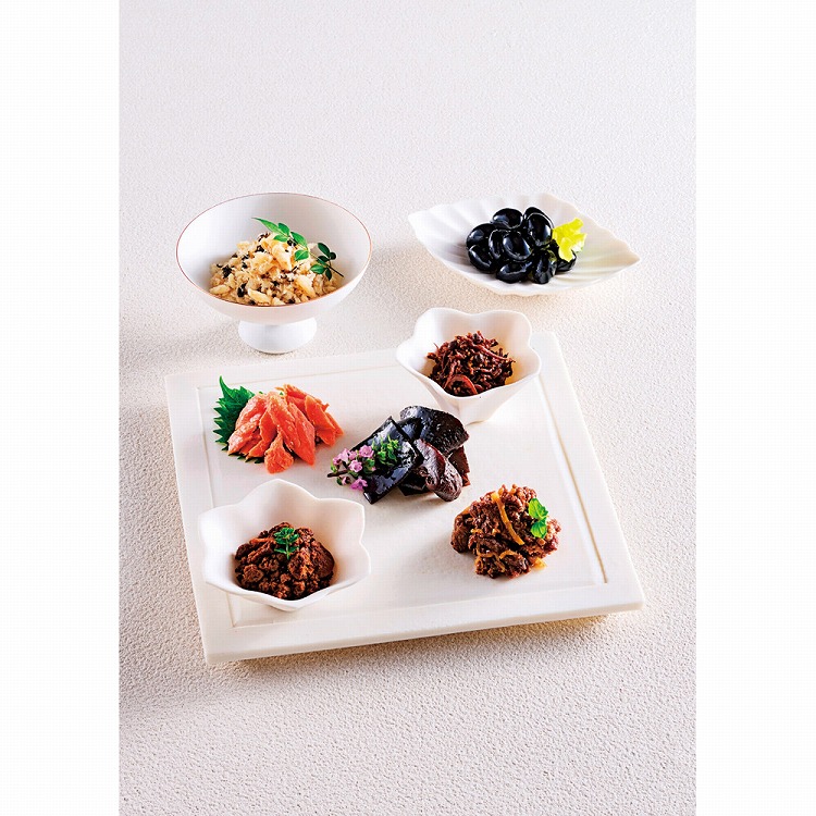 商品内容●セット内容:丹波くろまめ250g(固形量130g)・和牛赤ワイン煮230g(固形量140g)・やわらかこんぶ170g・真鯛ほぐし身100g・紅鮭茶漬65g・まさご煮50g・さざ波山椒煮50g各1