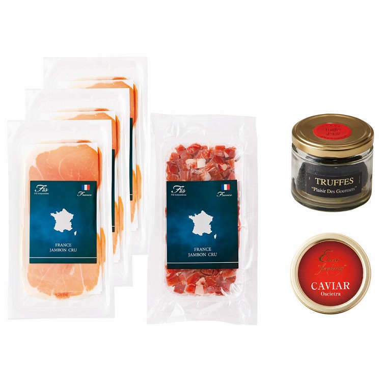 商品内容●セット内容:ジャンボンセックスライス20g(2枚入り)×3、ジャンボンセックダイス100g・サマートリュフ50g・オセトラキャビア30g各1
