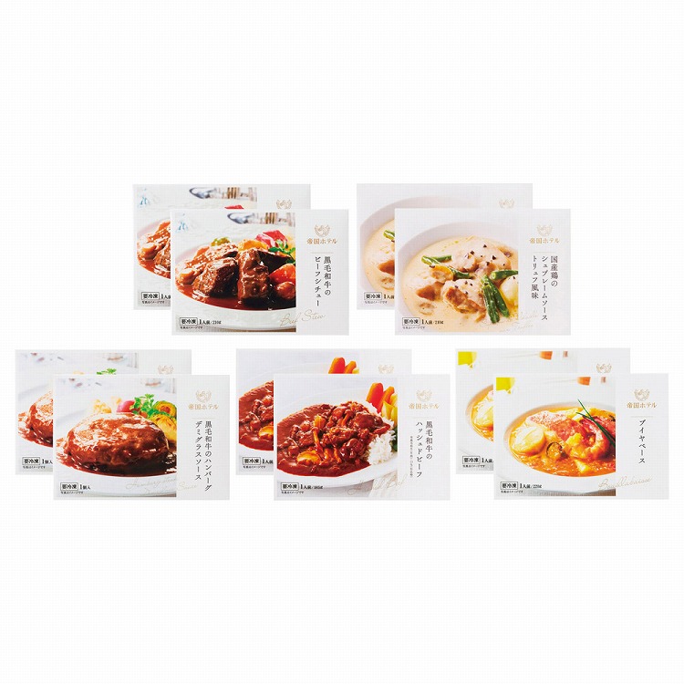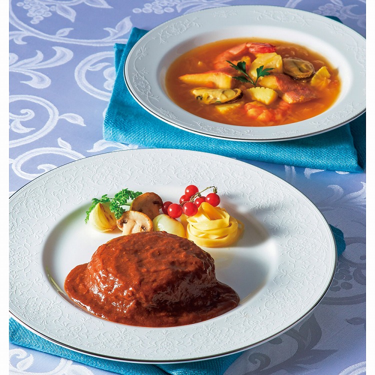 商品内容●セット内容:黒毛和牛のビーフシチュー210g・国産鶏のシュプレームソーストリュフ風味210g・黒毛和牛のハンバーグデミグラスソース190g(固形量95g)・黒毛和牛のハッシュドビーフ185g・ブイヤベース220g各2