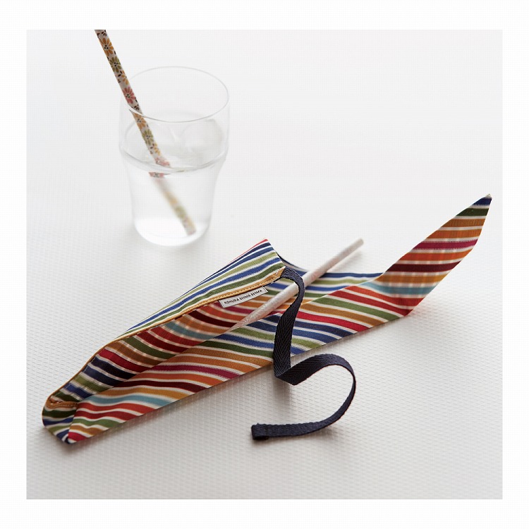 さらなる発展をとげる、革新的な織物 日本のものづくりは元来より環境に配慮したものが多く、国連が提唱する「SDGs(持続可能な開発目標)」の考え方にも沿っています。風呂敷などで知られる小倉織の「小倉 縞縞」もそのひとつです。丈夫で、何度でも繰り返し使うことができる小倉 縞縞の風呂敷は地球環境にやさしい存在。使いこむほどにシルクのようななめらかさが生まれ、より愛着が湧くのも魅力と言えるでしょう。 江戸時代から続くその織物にSDGsの17のゴールを現す17のカラーを縞で表現した箸袋を日常に取り入れれば、エシカルなライフスタイルへの意識がさらに高まるはず。再生ポリエステルを使ったよこ糸と木綿のたて糸を織ることで伝統と革新を表現していると聞けば、所有する喜びもひとしおです。箸だけでなく、マイストロー入れなど使い方は様々です。
