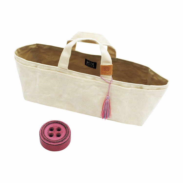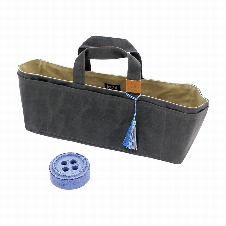 パラフィン加工が施された帆布の道具入れと、ボタンをモチーフにした岩手県・南部鉄器の文ちんのセットです。